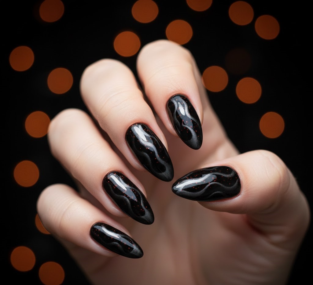 Black chrome stiletto nails bring an intense, mirror-like shine that instantly commands attention. The deep metallic base shifts under the light, giving the nails a bold, futuristic effect. Silver flame tips rise from the edges, creating a sense of motion and edge that enhances the shape. The chrome finish makes the flames glow even more dramatically. This design pairs beautifully with nighttime looks, leather pieces, and sleek outfits. The flames elongate the nails, exaggerating the sharp silhouette. The contrast of black and silver feels powerful without being overwhelming. The polished surface gives the nails a high-end feel. This look is perfect for someone who loves drama with intention. Despite the boldness, the design remains surprisingly wearable. It can suit concerts, parties, or elevated everyday styling. The flame detail can also be customized thicker or thinner. Its versatility makes it a standout choice. Ultimately, this set feels fierce, futuristic, and impossibly confident.