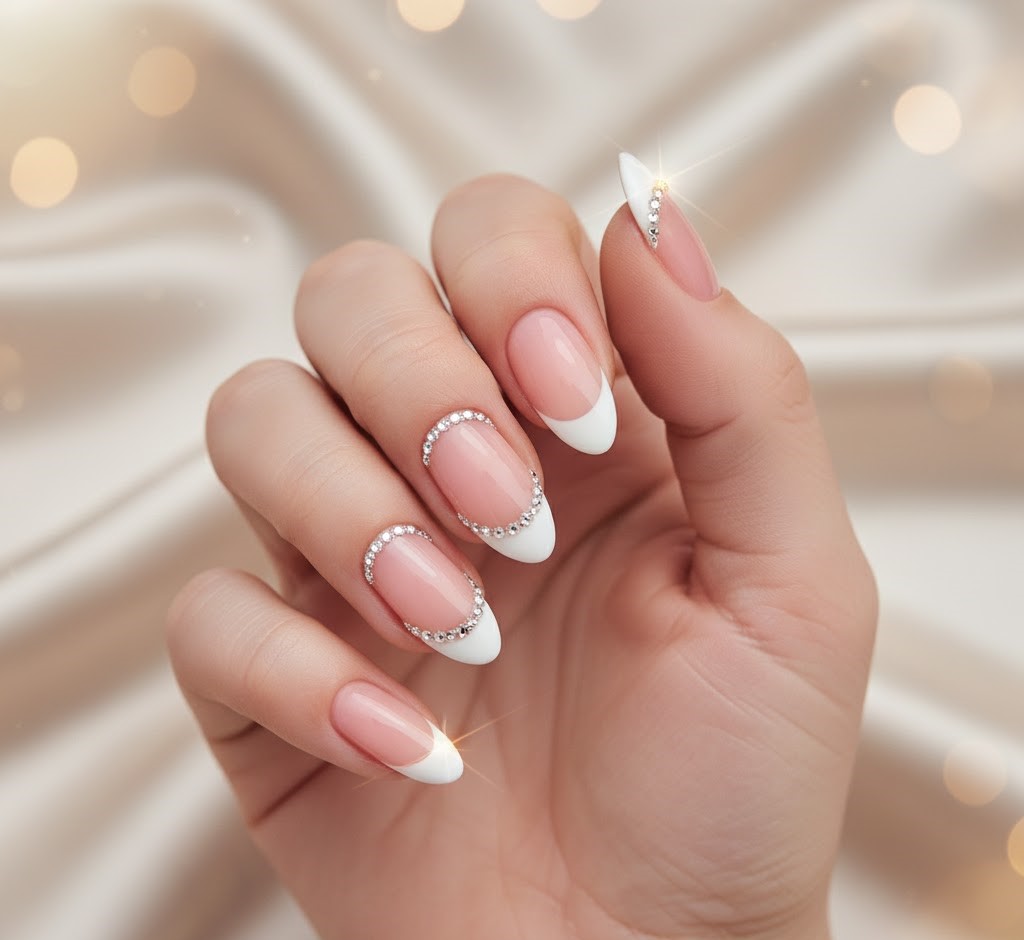 Crystal French tips elevate the traditional French manicure into something strikingly luxurious. Instead of the classic white, the tips are created using clear acrylic, giving a glass-like transparency. Tiny crystals line the smile line, adding sparkle with every movement. These crystals catch the light in a dazzling yet refined way. The transparency makes the design feel modern and airy. It’s a perfect blend of minimalism and glamour. The stiletto shape makes the crystals appear even more delicate. This look pairs beautifully with evening wear or elegant occasions. It complements jewelry effortlessly. The clear tips create a futuristic effect that remains soft and wearable. Each nail feels like a tiny piece of jewelry. The design draws attention without overwhelming the look. It’s timeless yet fresh. Ultimately, these crystal French tips give sophistication with a luminous twist.