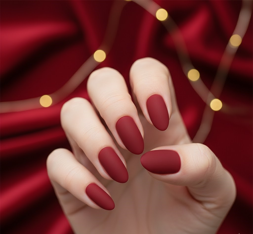 Red velvet matte stiletto nails deliver a seductive, plush finish that instantly stands out. The deep red shade looks like crushed velvet, rich and bold in color. Matte texture softens the shine, giving the nails a luxurious, soft-touch appearance. Combined with the stiletto shape, the color feels dramatic and commanding. This design exudes confidence and sensuality. It pairs beautifully with evening looks or monochrome outfits. The matte surface helps highlight the richness of the color. It’s a look that feels classic yet daring. The deep red shade is universally flattering. Simple but impactful, it doesn’t need additional embellishment. It brings immediate attention to your hands. The nails become a statement accessory on their own. Whether worn casually or dressed up, the impression remains powerful. This set radiates strength, elegance, and a sultry edge.