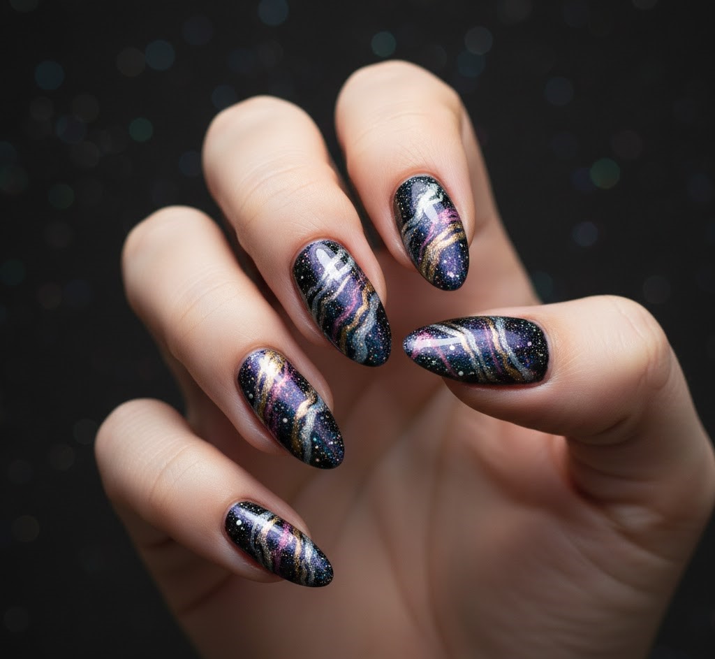 Holographic galaxy nails transform your fingertips into cosmic works of art. The base shifts through purples, blues, greens, and silvers depending on the lighting. Each movement reveals a new dimension of color. Speckled fine glitter mimics distant stars scattered across space. The holographic effect brings depth and motion to the nails. This design feels futuristic and mesmerizing. It’s perfect for someone who loves standout, high-impact looks. The stiletto shape enhances the illusion of stretching into the universe. The overall effect feels dreamy yet bold. These nails pair effortlessly with metallic accessories. They add instant personality to any outfit. The color-shifting tones make the nails look different from every angle. It’s a playful yet glamorous set. For anyone drawn to cosmic or fantasy aesthetics, this design feels magical and captivating.