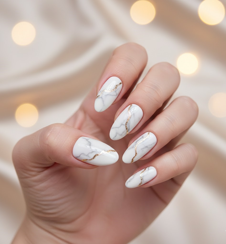White marble stiletto nails offer a clean, artistic elegance reminiscent of sculpted stone. A crisp white base is swirled with delicate gray veining to mimic natural marble patterns. Each nail appears like a miniature piece of polished stone. Gold foil accents elevate the design, adding warmth and richness. The combination feels modern, chic, and timeless. These nails complement neutral outfits beautifully. They bring sophistication without feeling overly ornate. The marble pattern adds visual texture while remaining soft. It’s a perfect design for both casual and professional settings. The stiletto shape adds drama to the clean palette. The gold details shimmer subtly under the light. This set looks expensive without trying. It feels balanced, artistic, and endlessly stylish. It’s a perfect choice for lovers of minimalist luxury.
