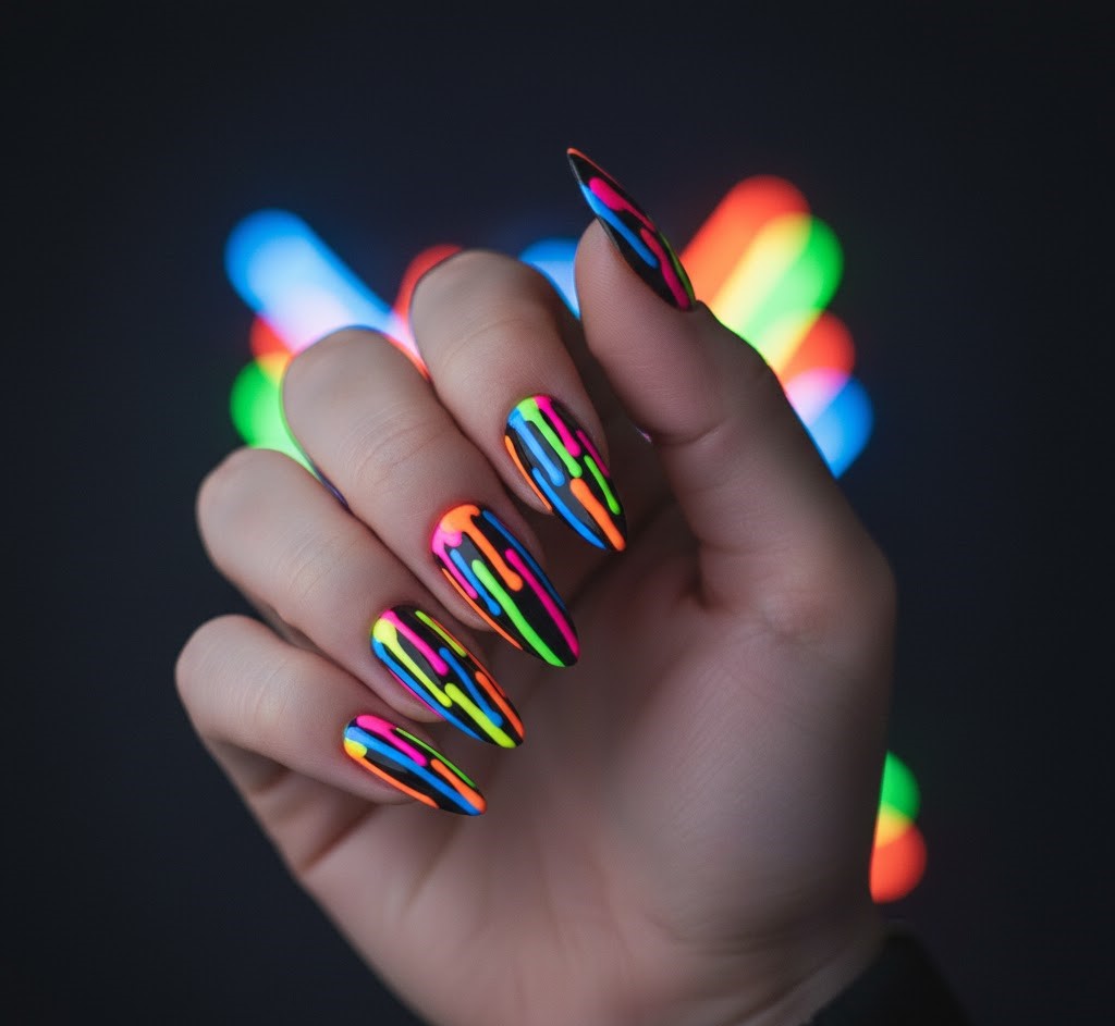 Neon drip art nails bring a burst of playful energy to the stiletto shape. A soft nude base keeps the design grounded and wearable. Bright neon colors drip from the tips as if freshly painted. The drips can be bold or thin, creating movement and personality. This look is vibrant, youthful, and fun. It stands out without feeling chaotic. The nude background balances the intensity of the neon shades. It’s perfect for summer, festivals, or creative fashion moments. The stiletto shape gives the drips extra flair. The design can be customized with multiple neon shades or a single bold tone. These nails add excitement to any outfit. They feel expressive and unique. The look brings artistic, street-style vibes. It’s a set that radiates personality and fearless creativity.