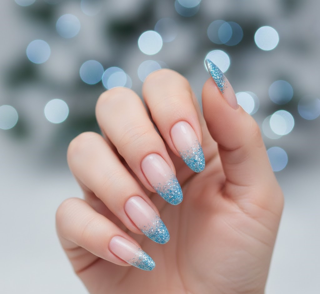Icy blue glitter tips bring a frosty, winter-inspired elegance to stiletto nails. The base begins with a pale, cool-toned blue that feels fresh and soft. The color gradually transitions into shimmering glitter at the tips. This gradient creates a snow-kissed effect that sparkles with every movement. The icy tones feel magical and serene. The glitter adds glamour without being overpowering. These nails are perfect for winter seasons, holidays, or cool-toned outfits. The stiletto shape makes the gradient appear elongated and graceful. The shimmer maintains a delicate, airy feel. This design is elegant yet playful. It works well for special events or everyday wear. The cool palette creates a calming visual effect. It’s a look that feels enchanting and beautifully balanced.