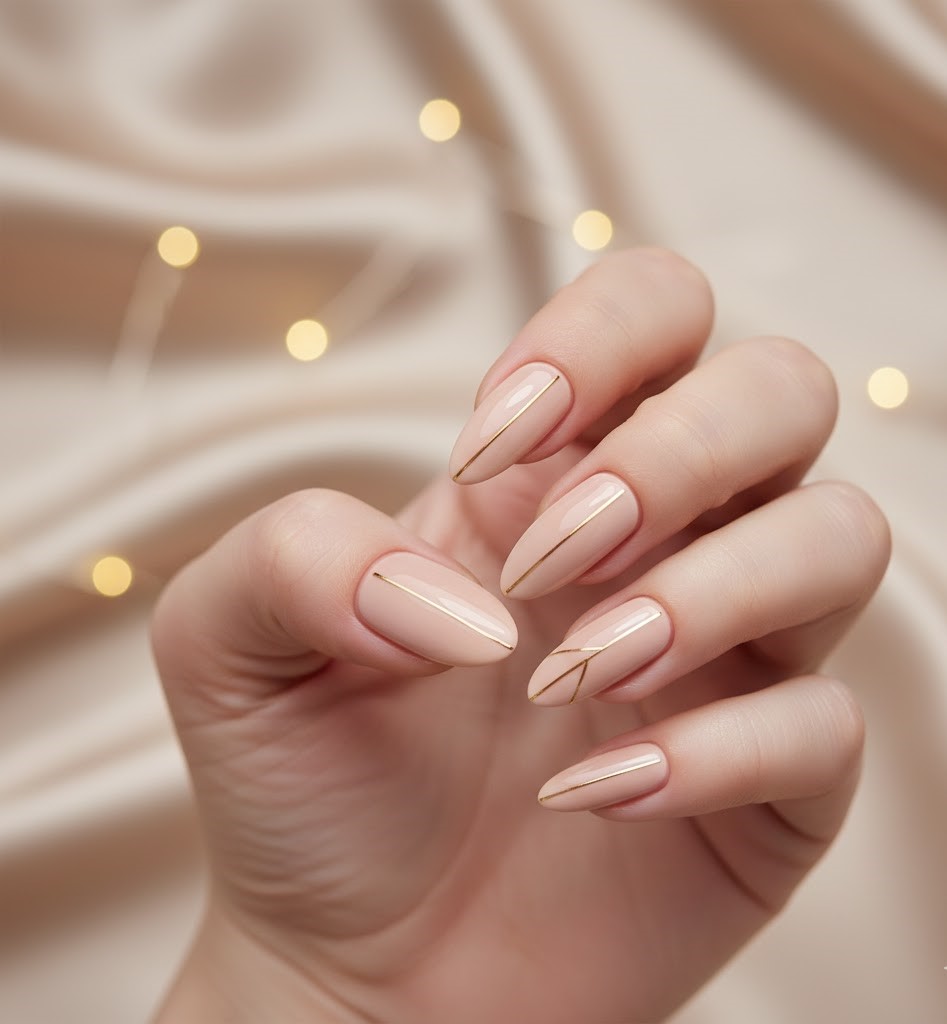 Nude and gold minimalist stiletto nails bring effortless chic to the forefront. A soft nude base keeps the design gentle and clean. Thin, delicate gold lines trace geometric shapes across each nail. The contrast adds quiet luxury without feeling bold. These simple lines create structure and elegance. The stiletto shape provides the perfect canvas for minimalism. This design pairs with any outfit or occasion easily. It’s ideal for someone who enjoys subtle detailing. The gold accents shimmer softly under the light, adding refinement. The look never feels overdone. It’s polished, modern, and versatile. The minimal lines enhance the natural beauty of the nails. This set strikes the perfect balance between simplicity and sophistication. It’s timeless, understated, and undeniably stylish.